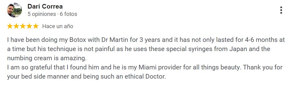- High trust and satisfaction — Dari considers Dr. Martin her go-to provider in Miami for all aesthetic needs