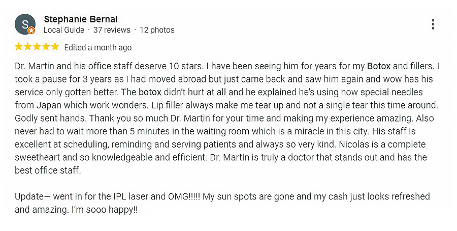 Stephanie had been a patient for several years before moving abroad for three years. On her return, she scheduled Botox and lip filler.
